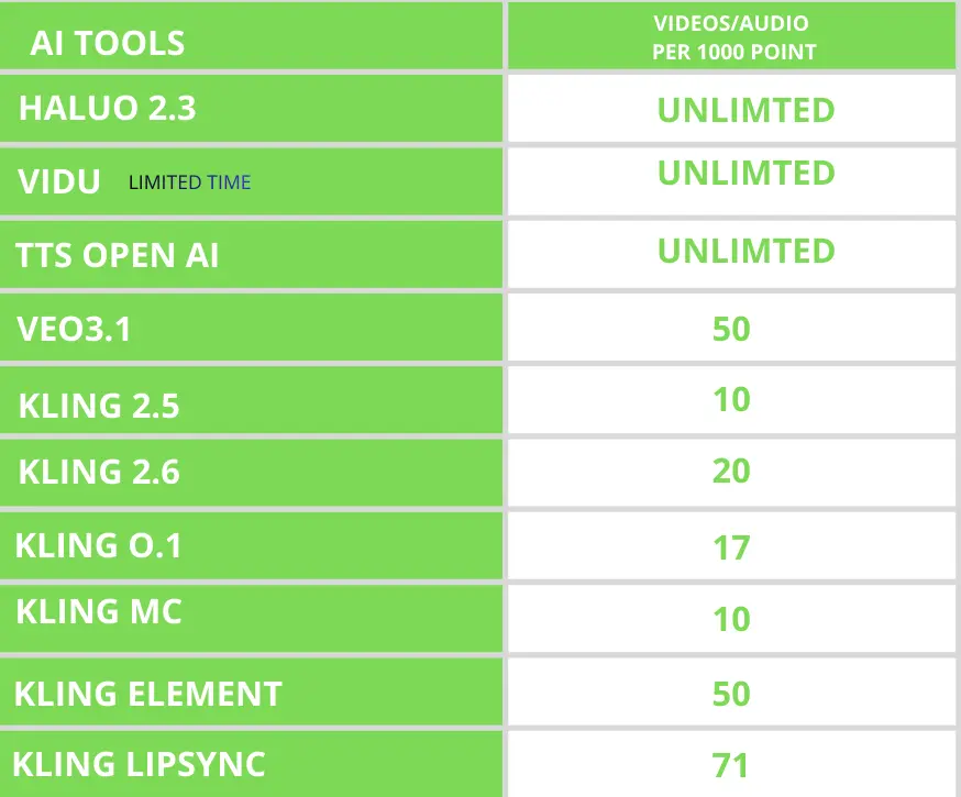 - unlimited TTS & VIDU & HAILUO 2.3 for life