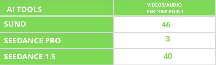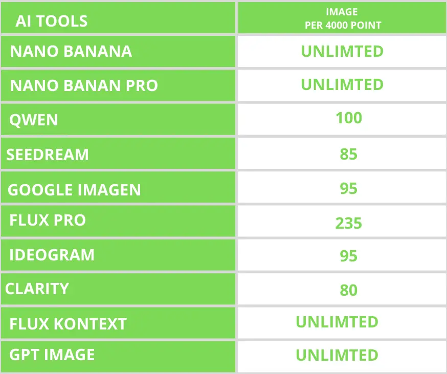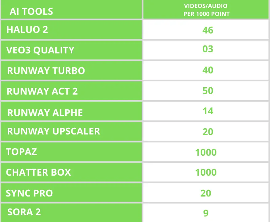 THE CALCULATIONS DONE BASED ON THAT THE VIDEO CLIP IS 5 SEC LONG EXCEPT (RUNWAY ACT TWO, SYNC PRO, KLING LIP SYNC, TTS, CHATTER BOX, AVATAR THE VIDEO CAN BE UP TO 20 SEC LONG)